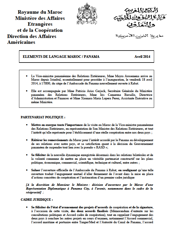 Mettre en exergue toute l’importance de la visite au Maroc de la Vice-ministre panaméenne des Relations Extérieures, en représentation de Son Ministre des Relations Extérieures, et tout l’intérêt qu’elle représente pour l’établissement d’une réelle coopération entre nos deux pays ;