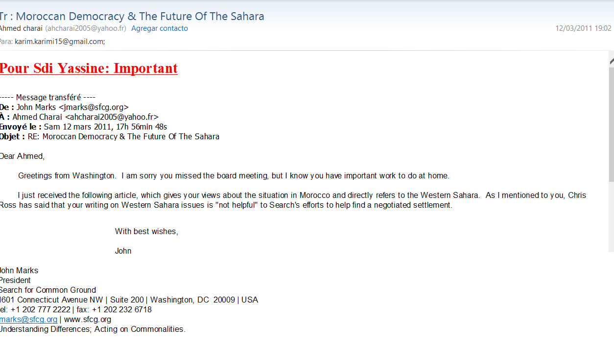 Ahmed Charai posts drawed the attention of Ambassador Ross to the Moroccan presence within the NGO. This led him to ask Mr. Marks stop “writing on Western Sahara issues” because it is “not helpful” to Search’s efforts to help find a Negotiated settlement”.